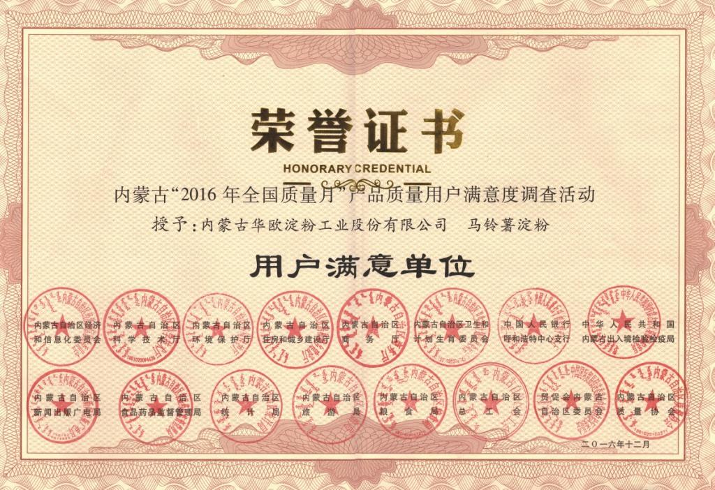 2016年12月,在內(nèi)蒙古“2016年全國質(zhì)量月”產(chǎn)品質(zhì)量用戶滿意度調(diào)查活動(dòng)中,我公司被授予“用戶滿意單位”稱號(hào)。